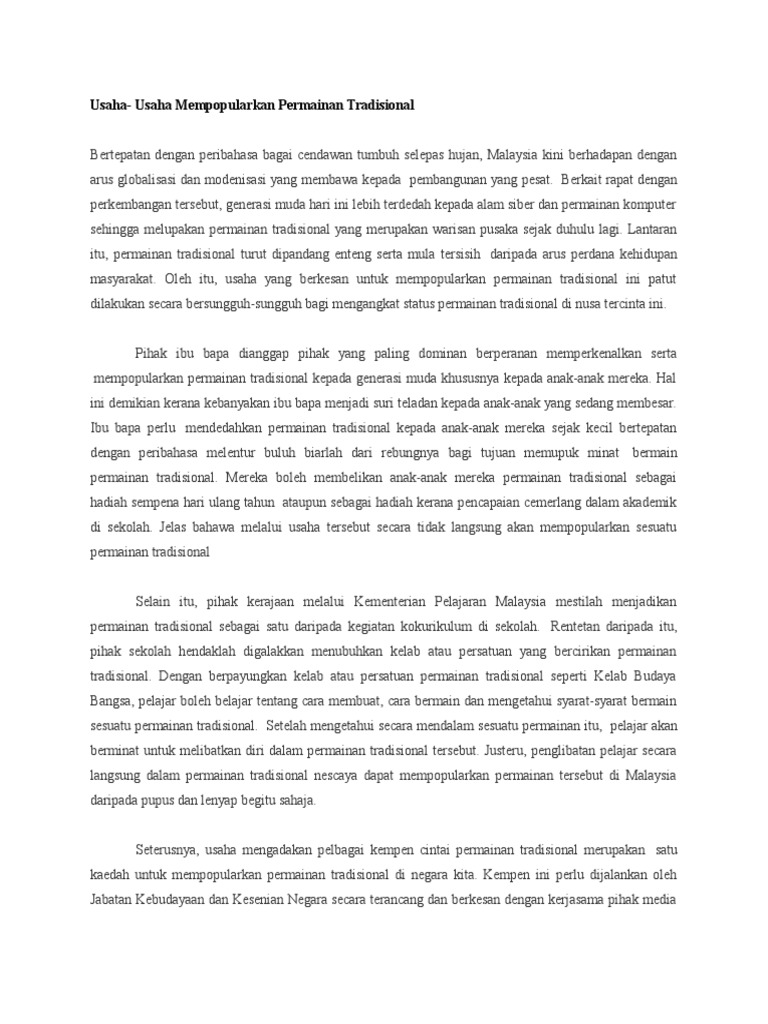 LAMAN BLOG CIKGU TAN CL: Ramalam Karangan SPM 2 - Karangan ... from 1.bp.blogspot.com Contoh karangan usaha dan cara popularkan semula permainan tradisional kepada masyarakat malaysia. Permainan tradisional, gobak sodor, petak umpet, mercon bambu, engklek, dll, beserta dengan gambar, penjelasan, dan cara bermain. Hal ini terjadi kerana pengaruh permainan moden seperti permainan video, permainan komputer, dan sebagainya berleluasa di pasaran. Permainan tradisional berbeda dengan permainan moderen yang kebanyakan merupakan permainan individual. Usaha bagi mengekalkan permainan tradisional mp3 & mp4. Menjadikan permainan tradisional sebahagian daripada aktiviti kokurikulum. Usaha bagi mengekalkan permainan tradisional adalah peranan sekolah agar mengadakan kegiatan kokurikulum yang berkaitan permainan tradisional. Sekalipun dimainkan oleh dua anak, kemampuan interaksi anak dengan temannya tidak terlihat.