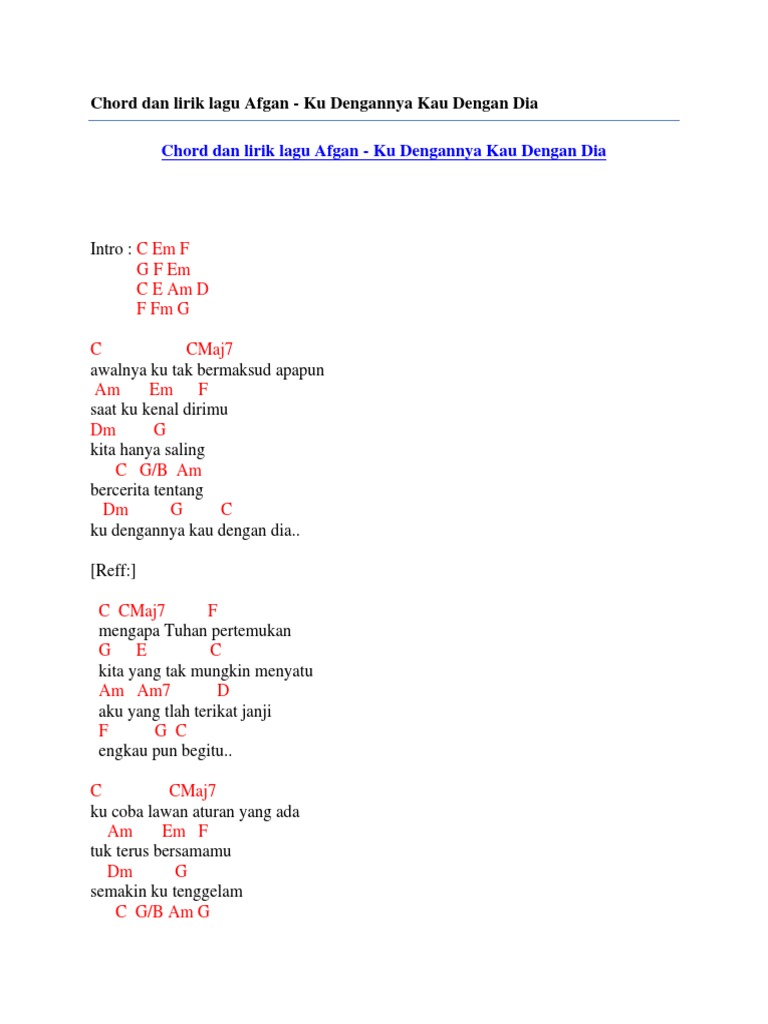 Lirik Lagu Afgan Ku Dengannya Kau Dengan Dia Lirik Lagu Terbaru from 1.bp.blogspot.com Jika hasilnya tidak berisi lagu yang anda cari, cobalah mencari lagu dengan nama artis atau dengan nama lagu tersebut. Untuk mendapatkan rbt ku dengannya kau dengan dia daripada afganmaxis = dail *131*536600# dan tekan send/calldigi = dail*233*1324162# dan tekan. verse c# c#maj7 awalnya ku tak bermaksud apapun a#m fm f# saat ku kenal dirimu d#m g# c# g#/c a#m kita hanya saling bercerita tentang d#m g# c# ku dengannya kau dengan dia. Awalnya ku tak bermaksud apapun saat ku kenal dirimu kita hanya saling bercerita tentang ku dengannya kau dengan dia mengapa tuhan pertemukan kita yang tak mungkin menyatu aku yang t'lah terikat janji. Ku dengannya kau dengan dia. Download lagu mp3 & video: Ku dengannya kau dengan dia. reff: c cmaj7 f mengapa tuhan pertemukan g e c kita yang tak mungkin menyatu am am7 d aku yang tlah terikat janji f g c.
